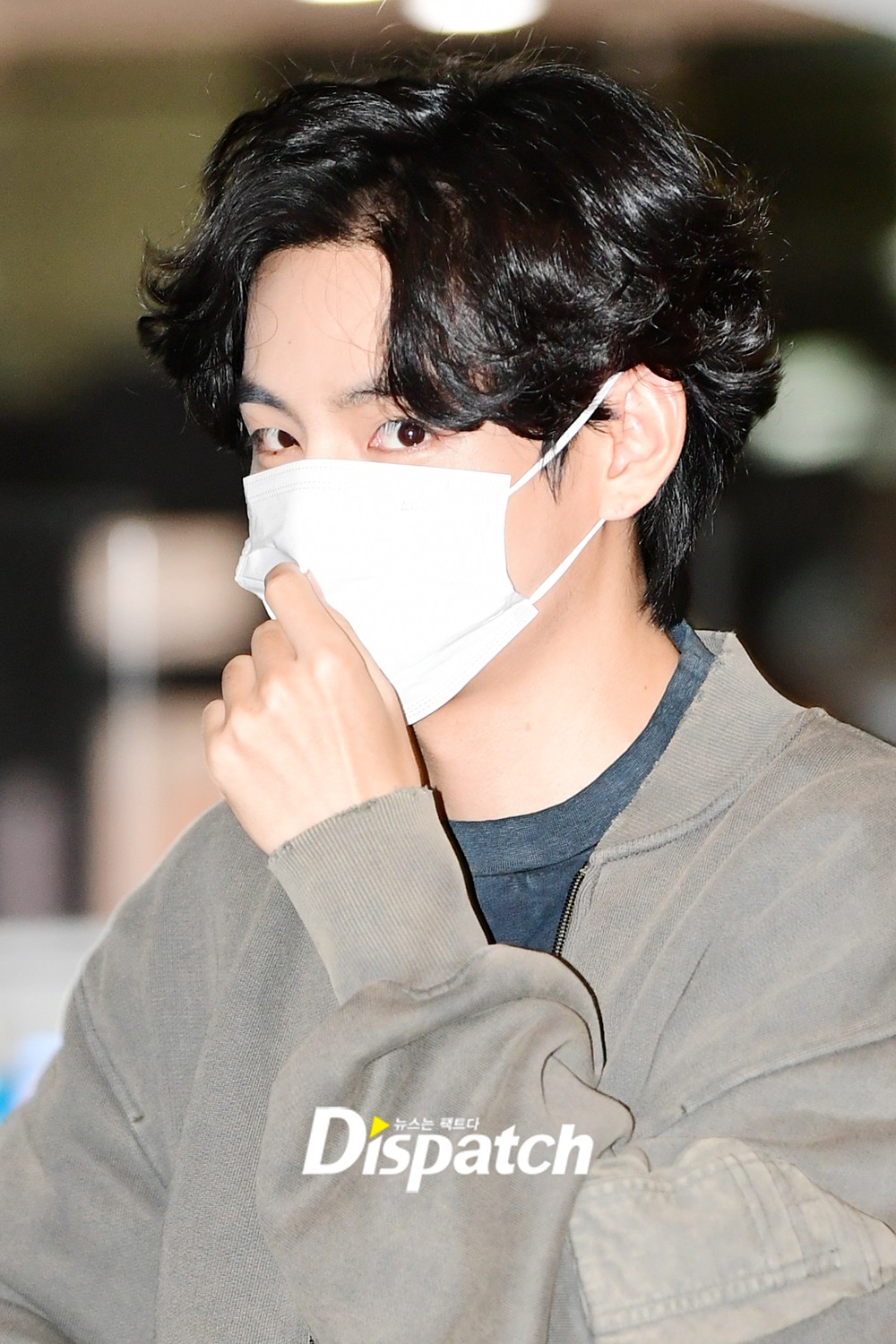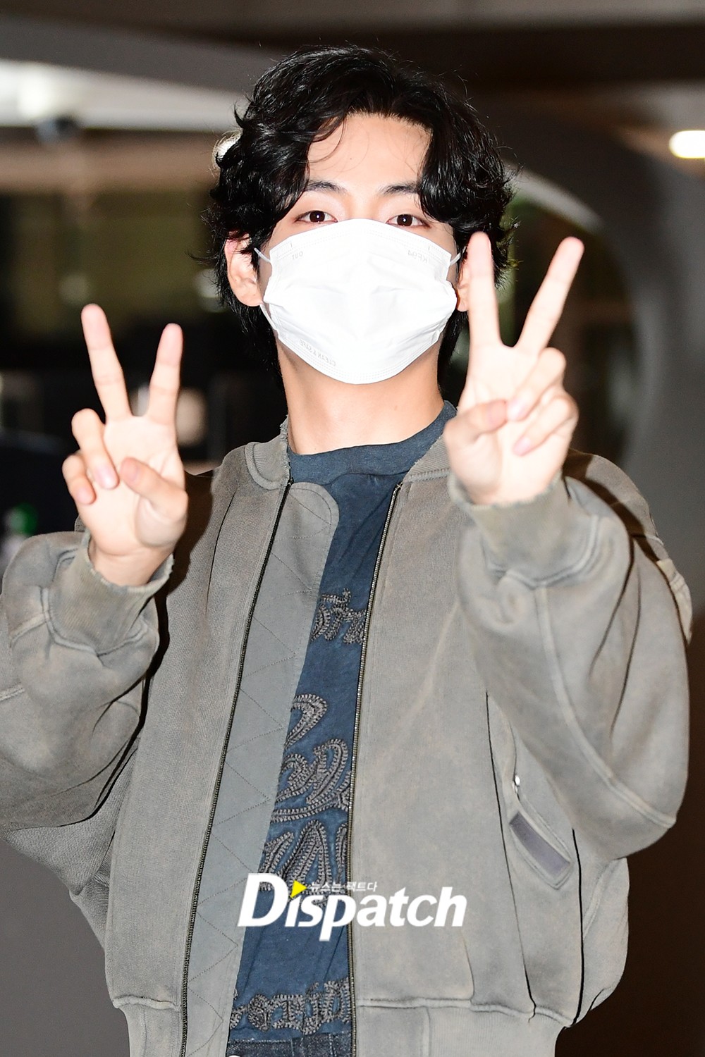 V was dressed in a khaki jumper and dark blue jeans, showing off his dandy charms.