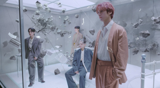 The trailer was intense and somewhat deep, showing the four members in a glass room in the setting of white, with the four members dressed in black looking from outside of the glass box.