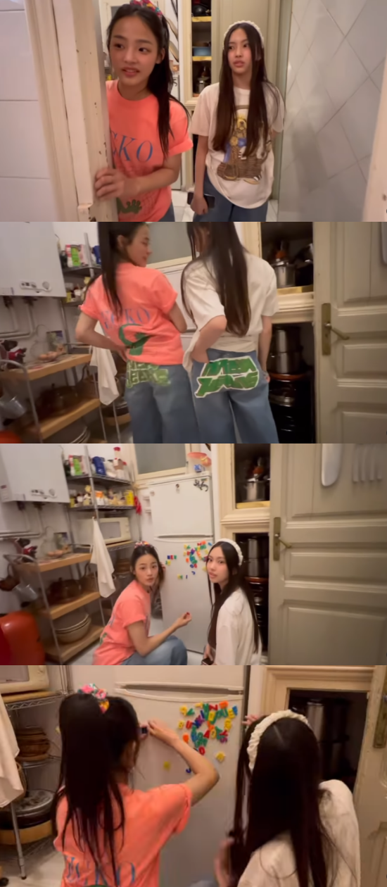 In the video, Min Hee-jin approached Minji and Hyein, who were doing something in the kitchen. She asked, "Where are you two?" Minji replied shyly, "It's a very pretty house in Spain."