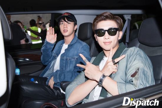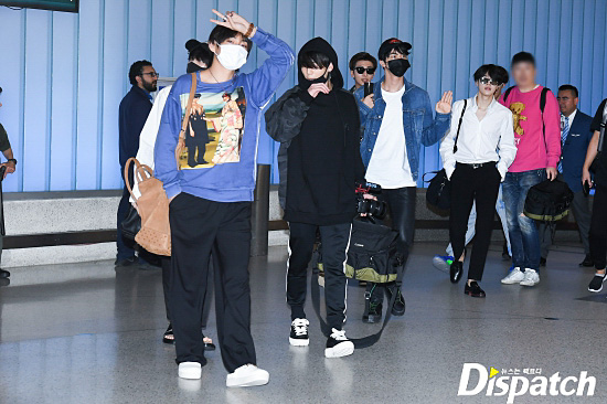 RM, Suga, Jungkook, and Jin waved at their fans as they left the airport. V did the classic “V” pose and J-Hope captured the scene through his phone.