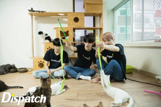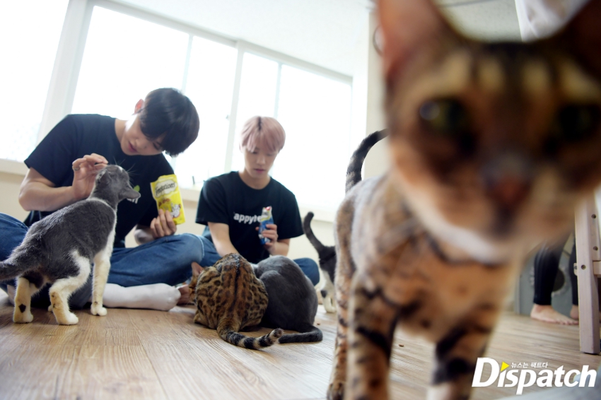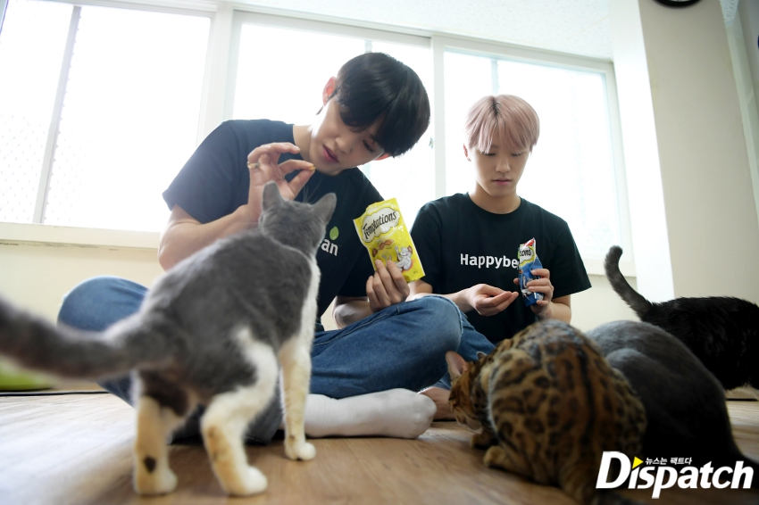 The youngest, Dino, claims to be a little afraid of cats. He had built up the courage to visit the shelter with the older members. Wonwoo came to his aid, with advice on how to treat cats.