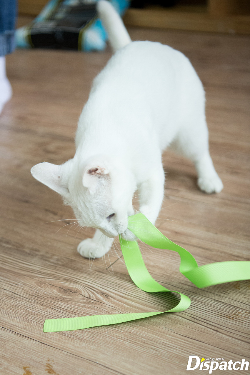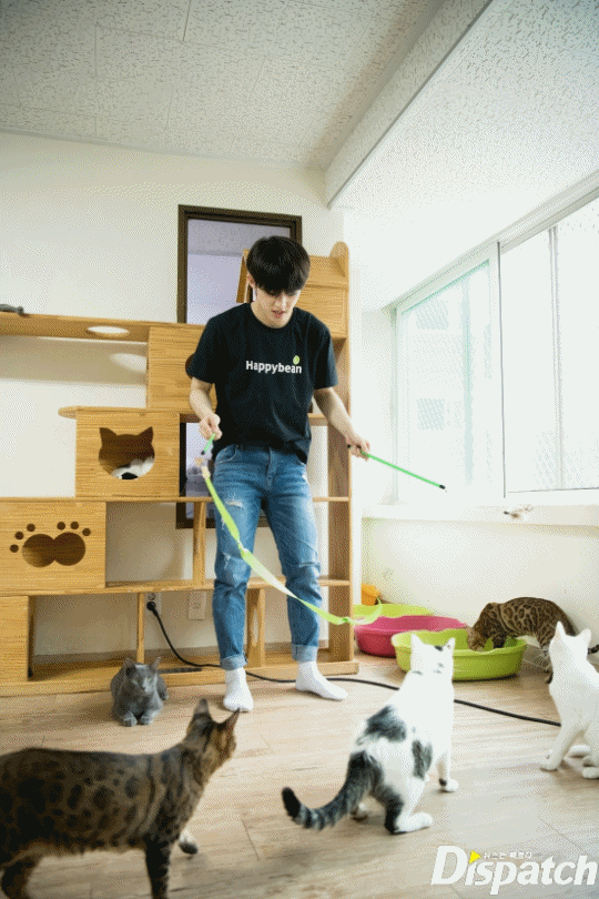 The busiest member this day was S.Coups. He made an effort to call all of the cats from every room. He sat down and stood up as he played with the cats.