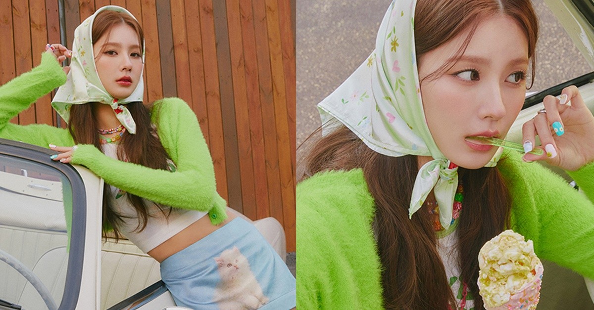 Miyeon was seen in sunglasses, and in the color of green. The idol held an ice cream cup in one picture.