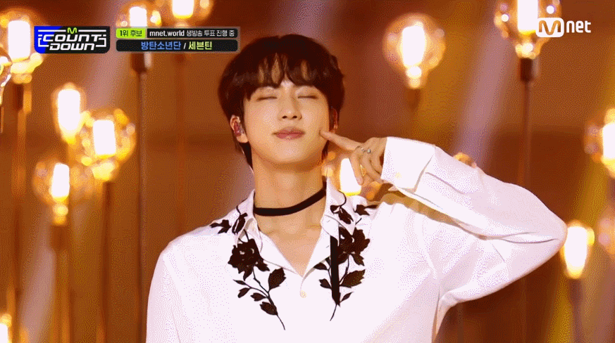 On the other hand, Jin took a cute pose by closing his eyes and sticking a finger into his cheeks, which is a common pose to portray cuteness.