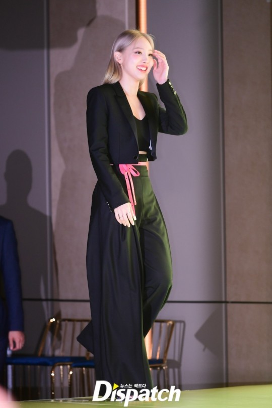 On this day, Nayeon gave a style point to her black suit with a pink belt.