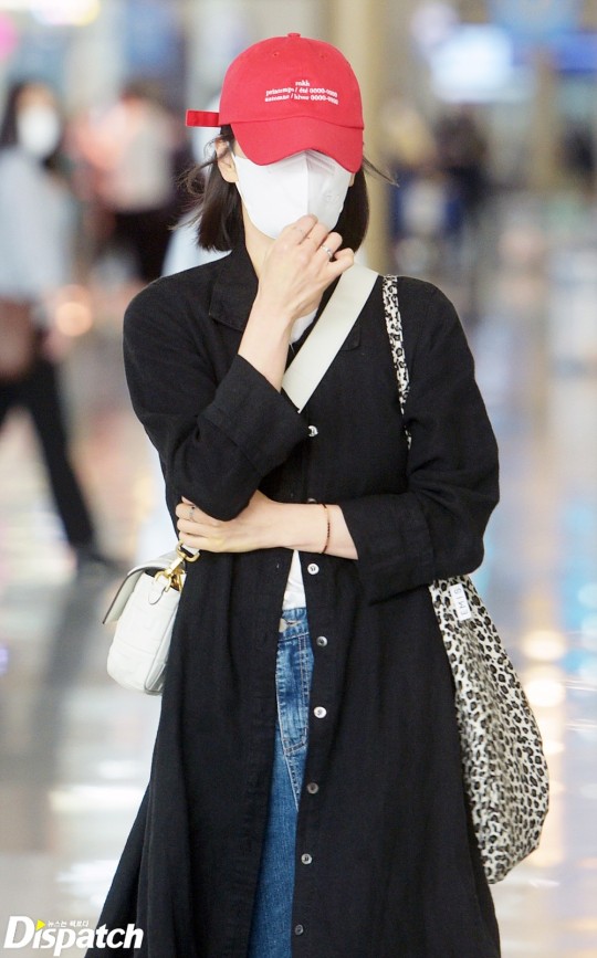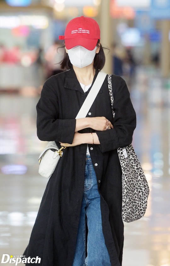 Song Hye-Kyo was wearing a casual outfit in comfortable jeans and sneakers, topping up her airport fashion with a red baseball cap and chic jacket. She responded with a hand greeting to the flashlight from cameras.