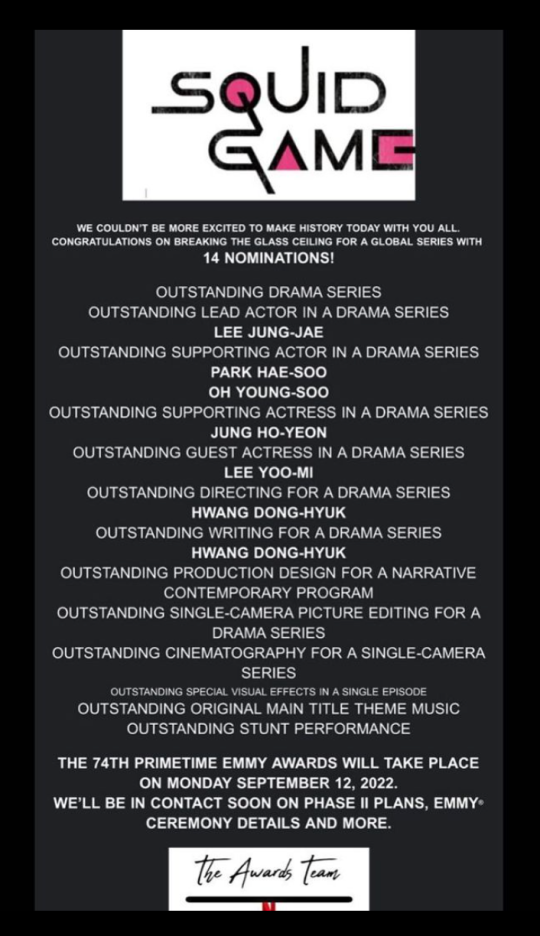 The other awards for which 'Squid Game' has been nominated this year include Outstanding Production Design for a Narrative Contemporary Program (One Hour or More), Outstanding Cinematography for a Single-Camera Series (One Hour), Outstanding Single-Camera Picture Editing for a Drama Series, Outstanding Original Main Title Theme Music, Outstanding Special Visual Effects in a Single Episode, and Outstanding Stunt Performance.