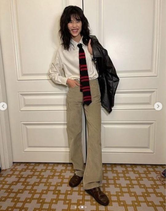 In one photo, Jung HoYeon wore a side-cut dress with slits around the chest area, showing off her sexy charms. In another photo, she was in a classic tweed style with her ‘daeng-gi hair’ with a modern twist to it. Lastly, the star showed off her unisex vibe by wearing a baggy outfit in a shirt, pants and tie.