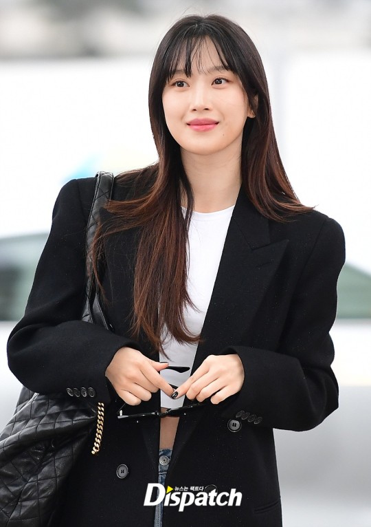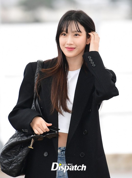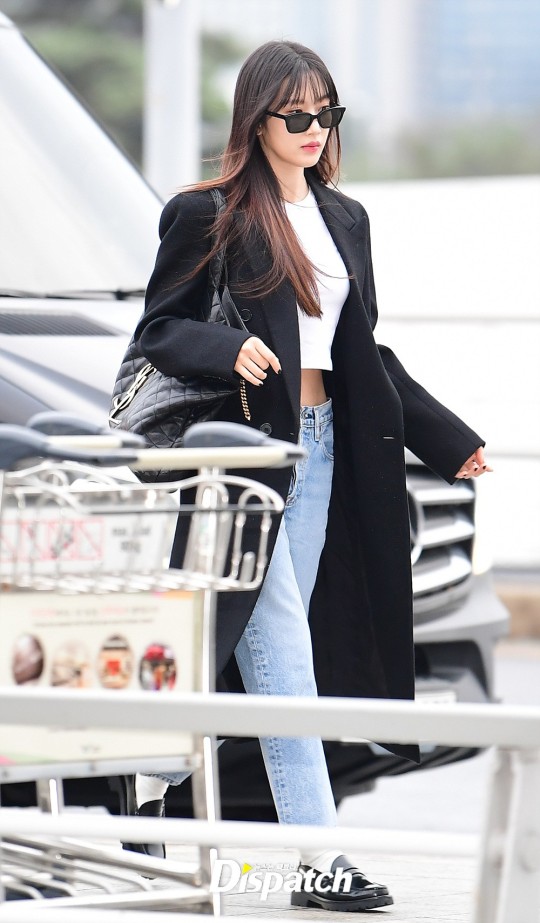 Moon Ga-Young looked chic and sophisticated in her airport fashion, matching a long black coat with denim jeans and a cute crop top.
