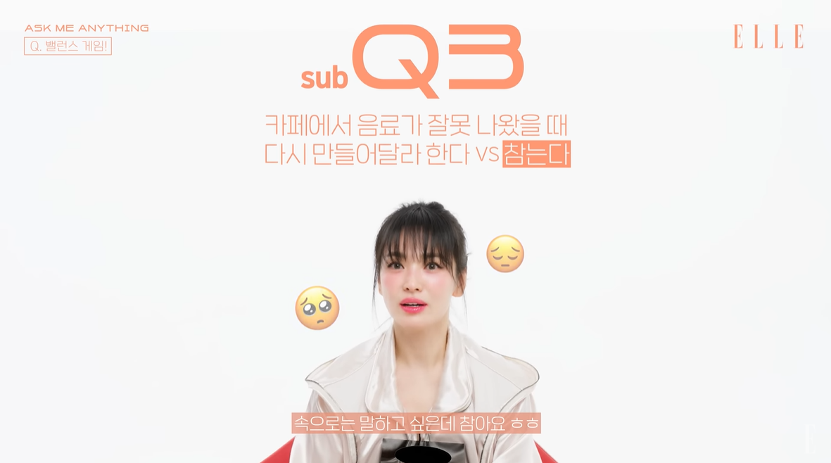 A balance game was also played, which involves choosing a more favorable option when given two options. Between red bean and cream, Song Hye-Kyo chose red bean, and between long hair and short hair, the actress picked short hair.
