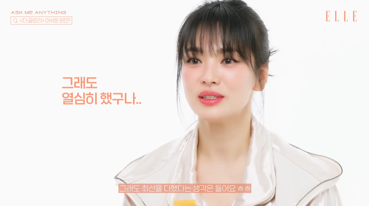 Regarding any regrettable scenes from shooting 'The Glory', Song responded, "at the beginning, I found all of the scenes difficult to act and express so I wondered to myself if I had made the right choice to take up the role. Actually, I thought to myself about wanting to re-shoot the scenes from the beginning if I was ever given the chance to.”