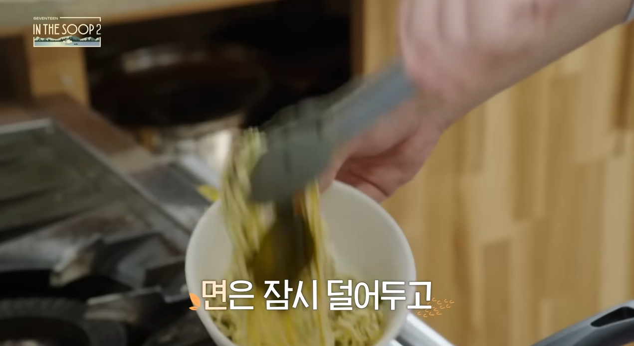 Mingyu gave Joshua a drink to relieve his hangover. But he needed food to relieve his hangover. Mingyu is going to cook ramen for Joshua.