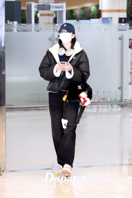 Eun-Chae was dressed in all black with a short parka jacket to add cuteness and simplicity to her airport fashion.
