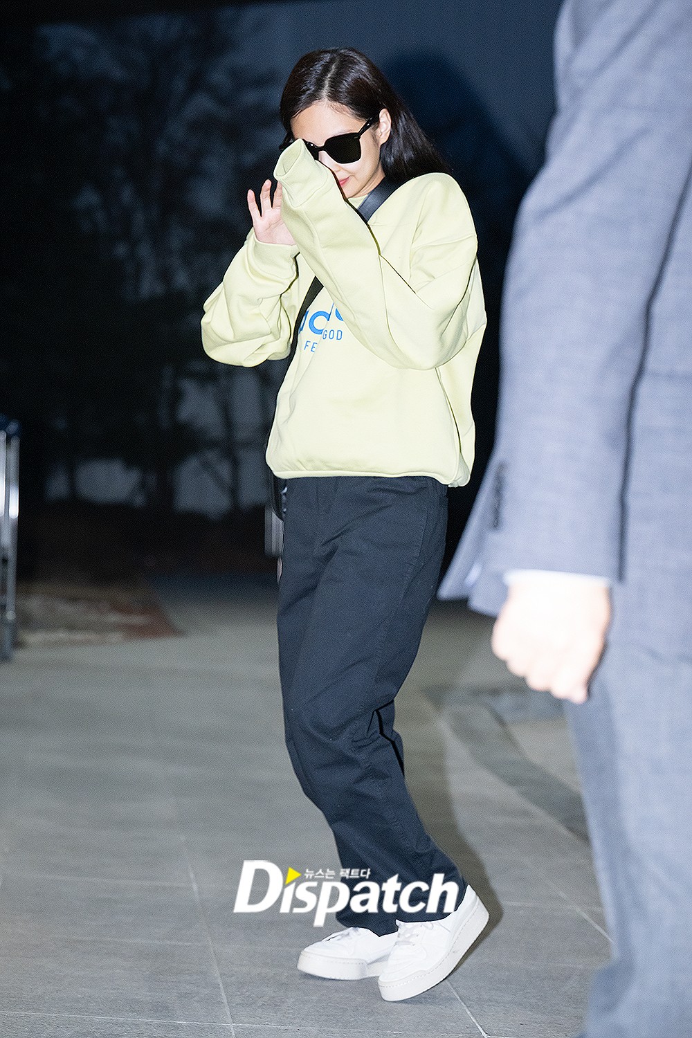 Jennie completed a comfortable airport fashion with a yellow t-shirt and black pants, slightly covering her face.