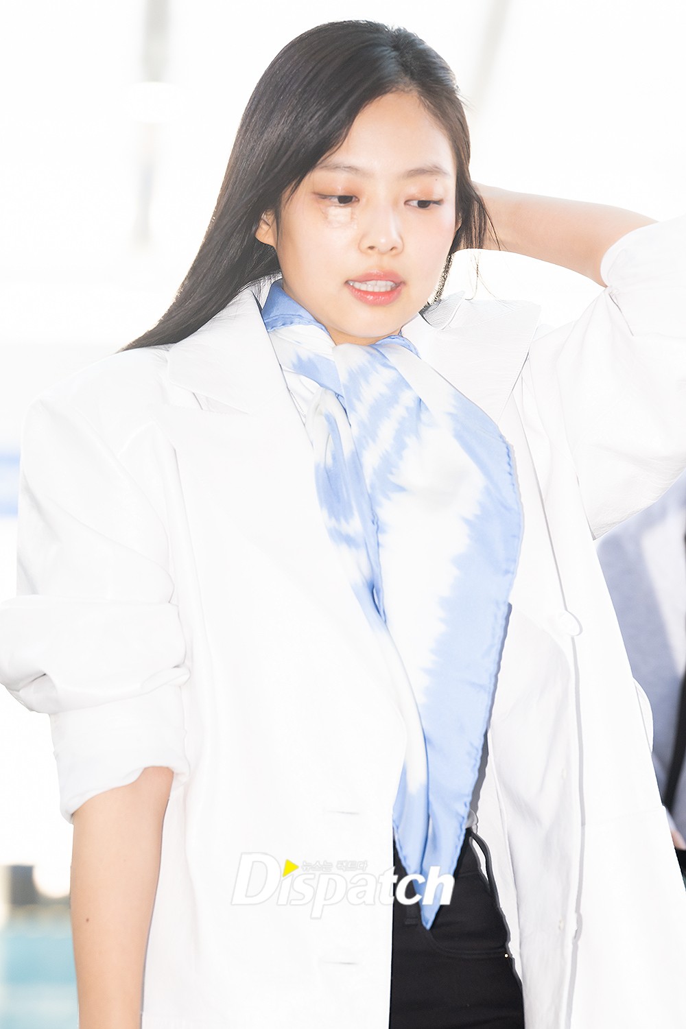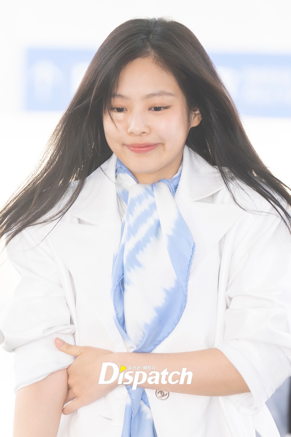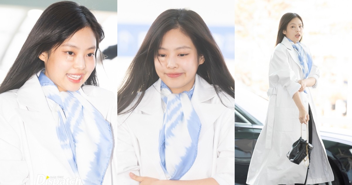 Jennie completed a clean airport fashion with a white long jacket and black pants.