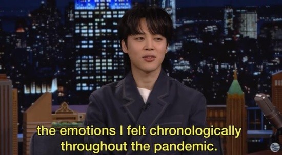 Jimin appeared on the "Jimmy Fallon Show" for the first time as a solo artist in about a year and a half after appearing as a whole BTS in July 2021 and had an interview with host Jimmy Fallon.