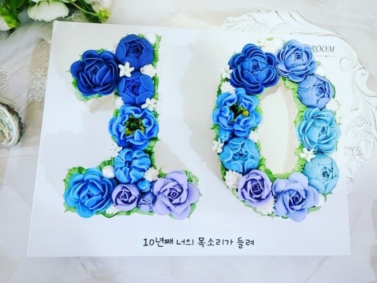 In front of them was a cake decorated with flowers with the number '10', and the cake had a candle in the shape of '10'.