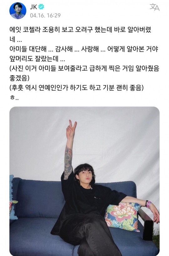 On April 16th, BTS’ Jungkook shared a photo of himself at the ‘2023 Coachella Valley Music and Arts Festival’ on Weverse, revealing that he had been spotted by Army fans.