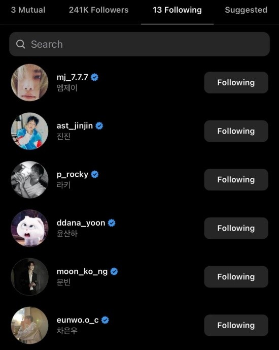 She also followed the members JinJin, Cha Eun-Woo, Rocky, San-Ha, and MJ's Instagram accounts along with ASTRO's official account.