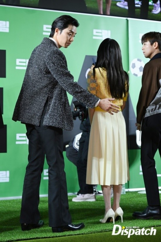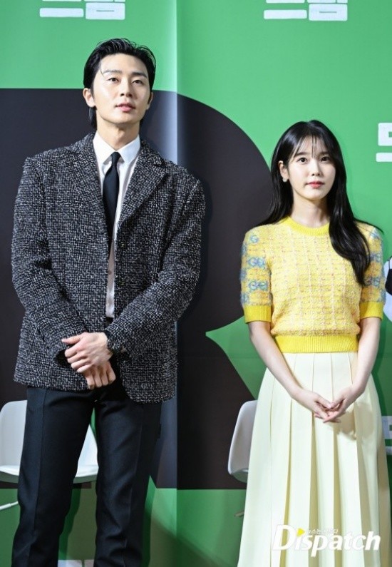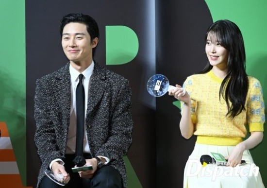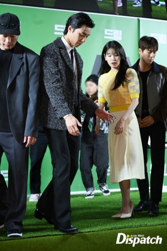 Park Seo-joon's manners stood out. When he took a group photo, he protected IU with his hands in case she fell off the stage.