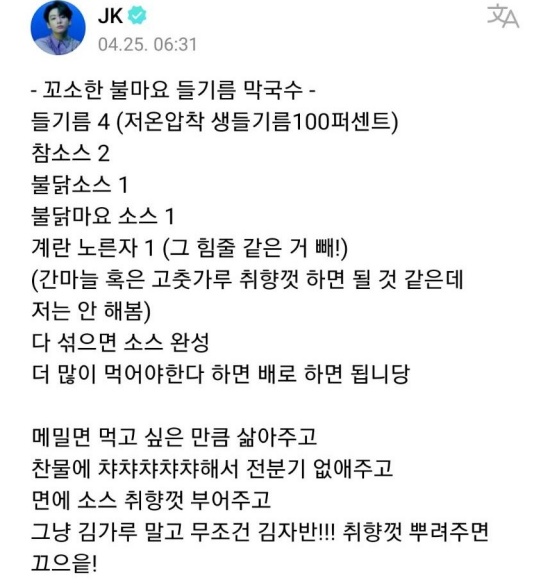 After the live broadcast, Jung kook organized the recipe and uploaded it. "Boil the buckwheat noodles as much as you want, and remove starch from the noodles in cold water," he said. "Pour the sauce on noodles to your taste, and sprinkle seaweed, and that's it."