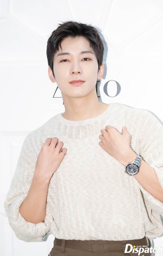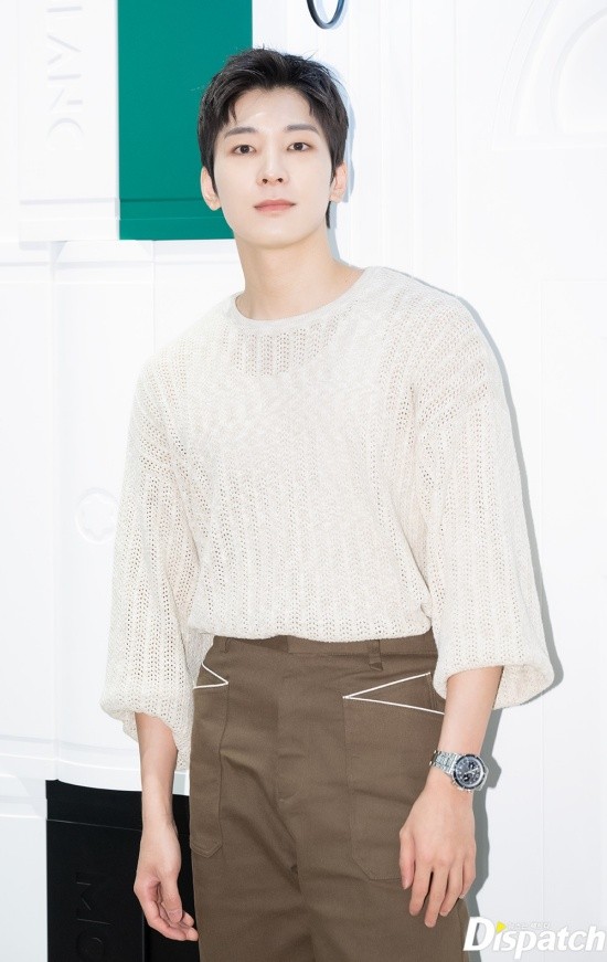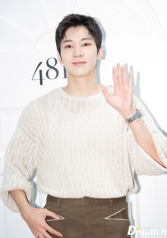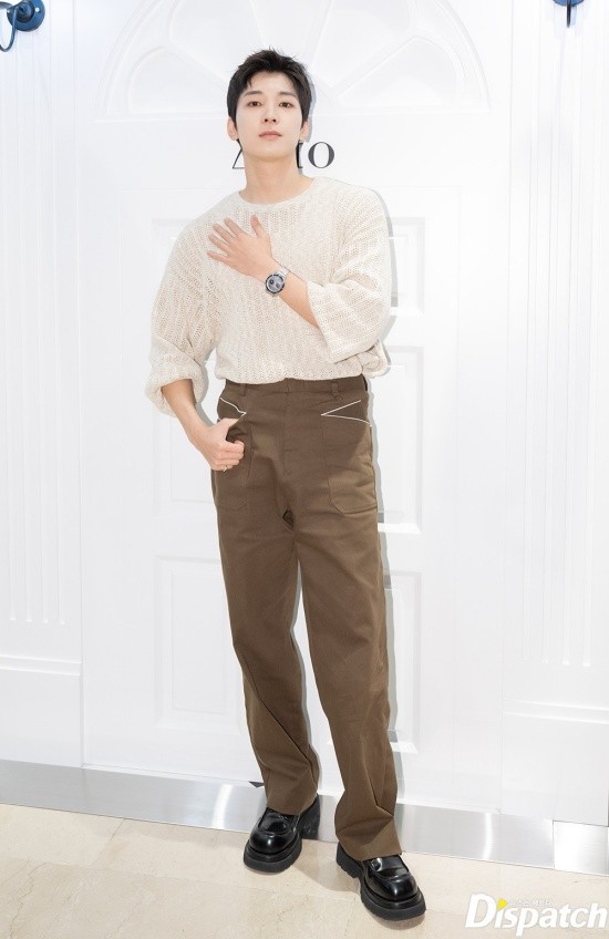 Wonwoo wore a beige coloured knitted top and brown chino pants.