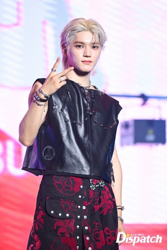 Taeyong styled himself with a leather vest and ripped jeans. The funky look stood out.