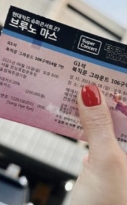 Ki Eun-se posted a photo on 18th of herself enjoying Bruno Mars' concert, and Song Hye-kyo's name was written in English under her ticket reservation number. Additionally, it was Song Hye-kyo's fourth ticket out of six, showing her success in booking six tickets.