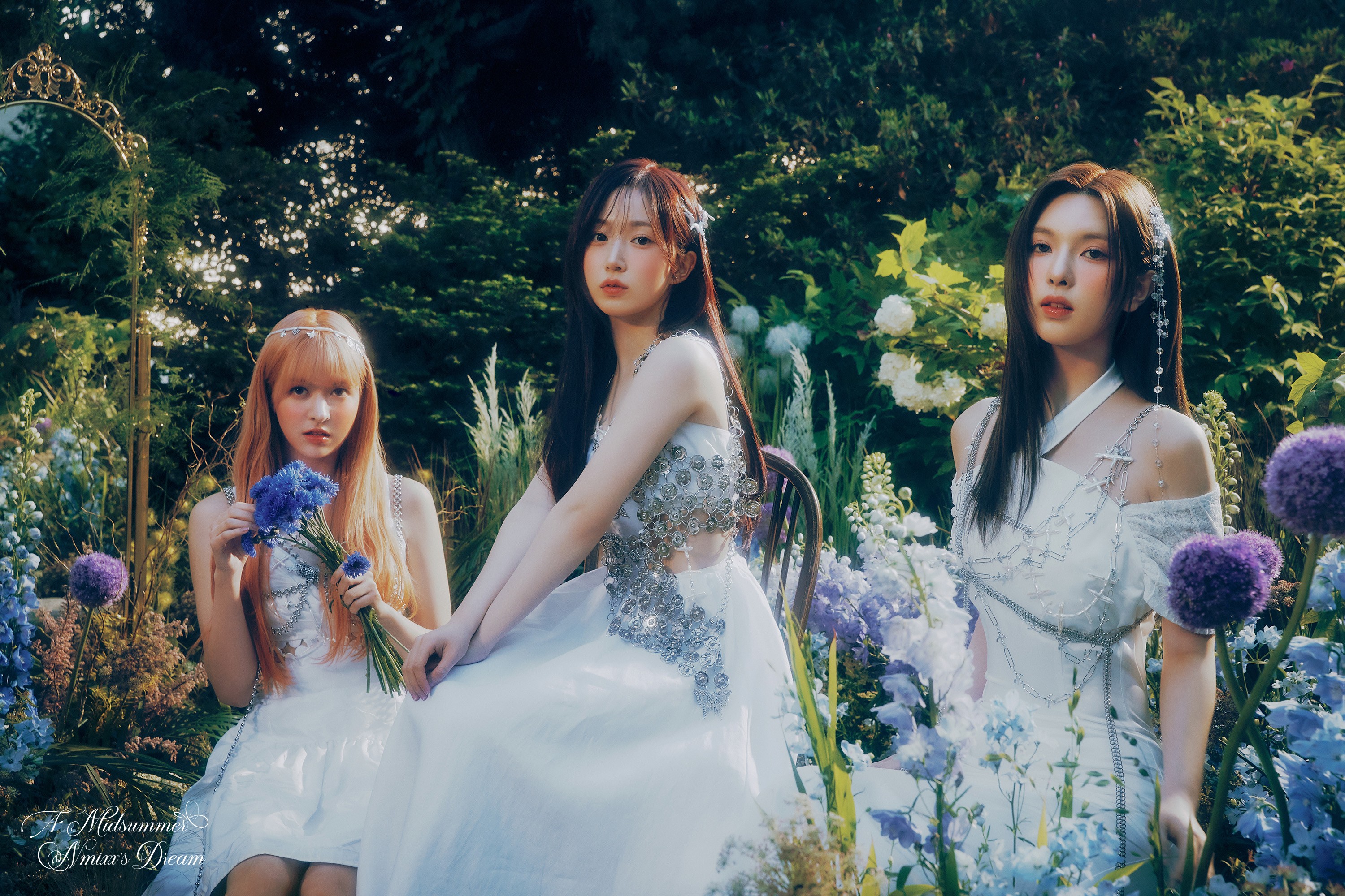 NMIXX members became ethereal forest fairies, wearing white dresses in an enchanting environment of lush greenery and flowers.