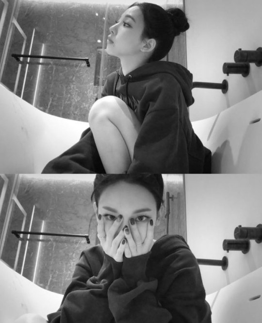 In the photos, Karina is wearing an oversized hoodie with her hair up in a clean bun.