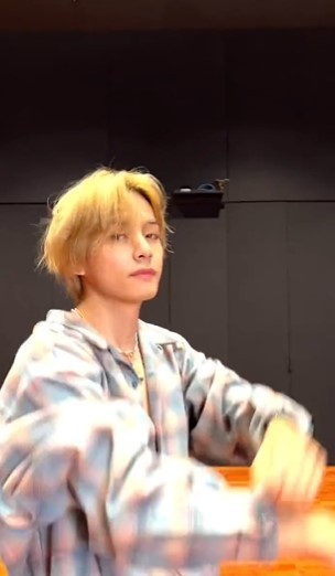 V dressed in a checkered oversized shirt and pink jog pants with blonde hair.