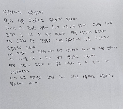 Seunghan conveyed his apologies through a handwritten letter, expressing, "I am truly sorry. I am well aware that my past thoughtless actions are causing a lot of harm to many people."