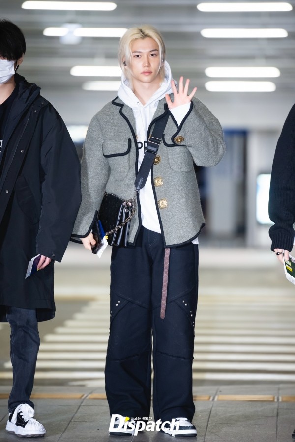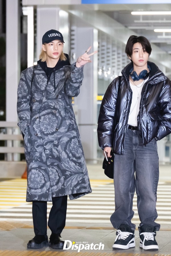 On December 13th, Stray Kids' Hyunjin and Felix waved for cameras before departing for '2023 Asia Artist Awards IN THE PHILIPPINES' at Incheon International airport.