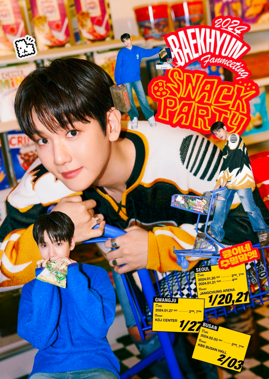 Along with the fan meeting announcement, they revealed a poster. Baekhyun, with a kitschy concept, captivated attention with his dazzling visuals, showcasing a hip yet adorable charm.
