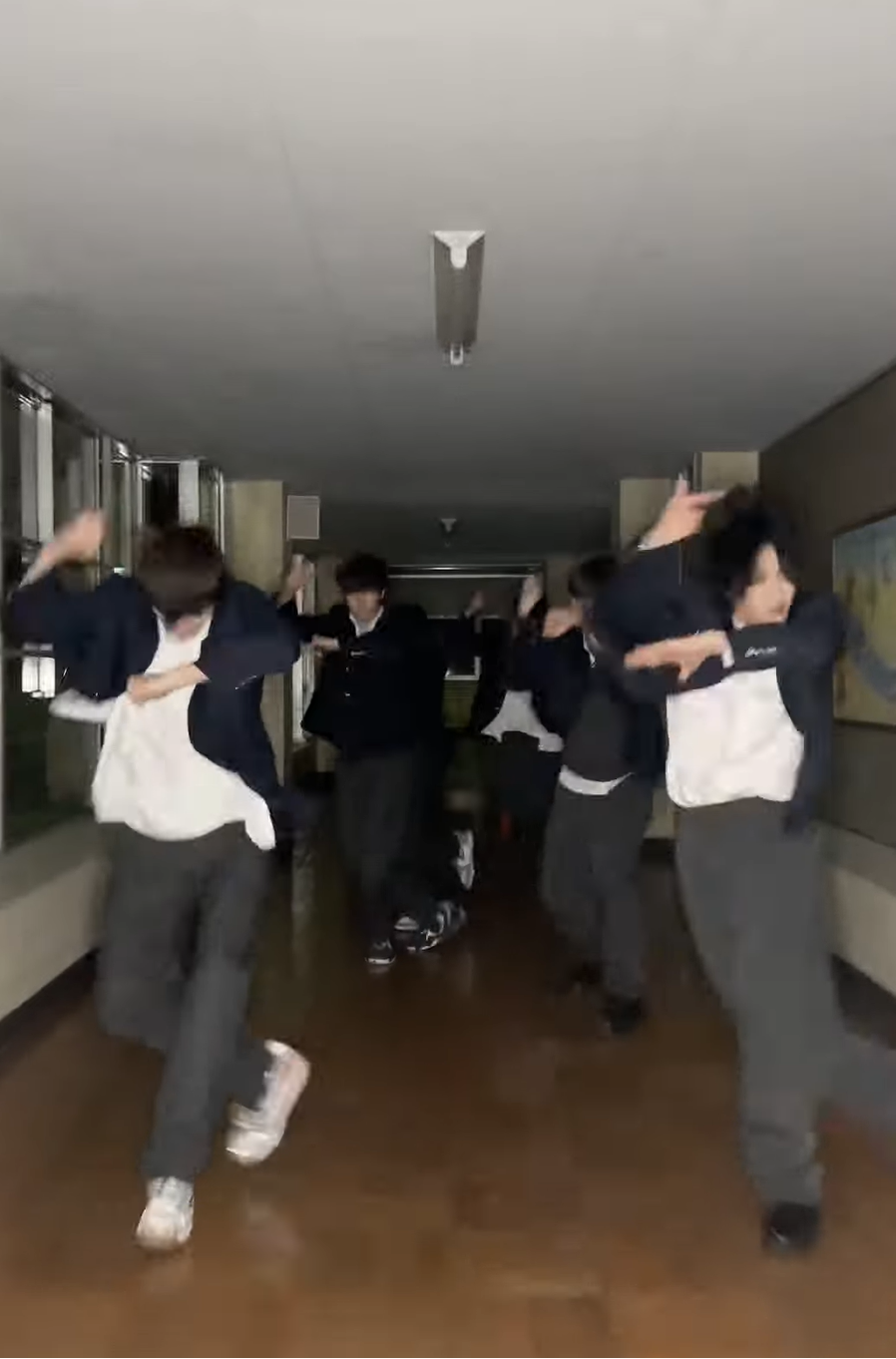 The members were standing in their school uniforms in what appeared to be a school hallway, dancing to EXO's 'Growl'.