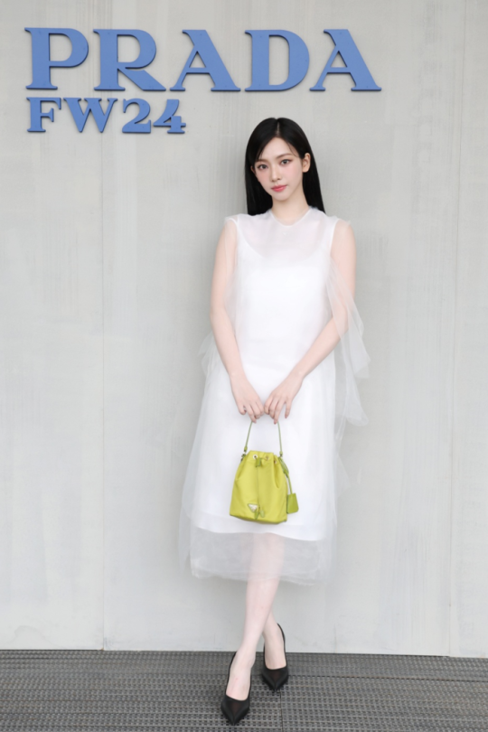 On this day, Lee Jae-wook showed off a chic, trendy look with a unique wool gray suit set-up and a shoulder bag made of black re-nylon and Saffiano leather, while Karina showed off her bright visuals by matching a white dress made of organza with a lime-colored re-nylon mini bag as point factor.