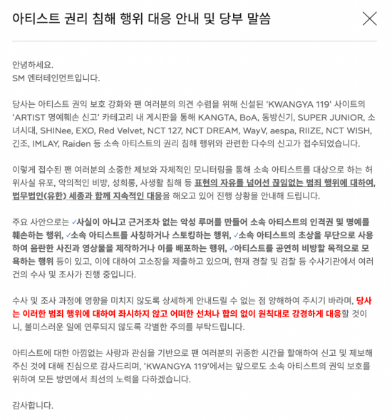 SM Entertainment posted an announcement on its website "KWANGYA 119" on Tuesday. "A number of reports have been filed on the 'Artist Defamation Report' board regarding infringement of rights of the artists," it said.