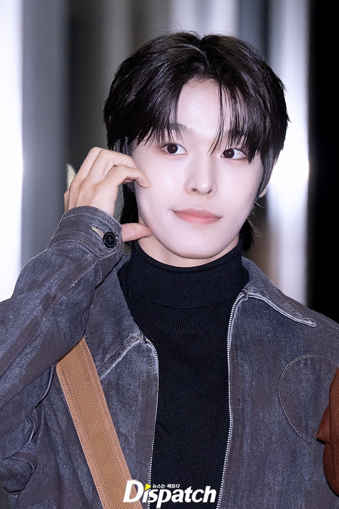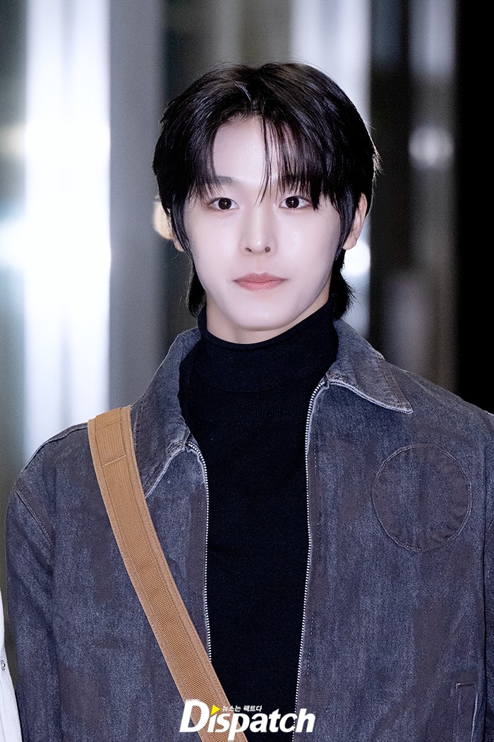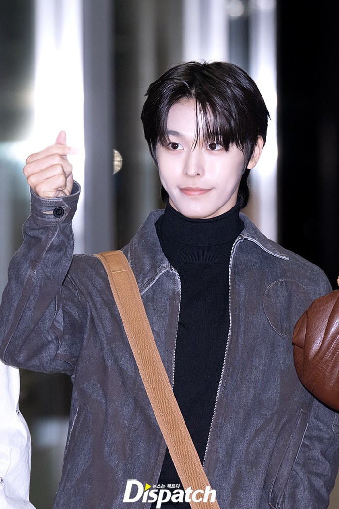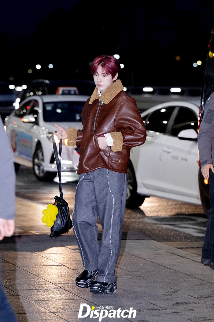 Yushi showed off his dandy airport fashion by matching jeans with a suede jacket, showing off his charming visuals.