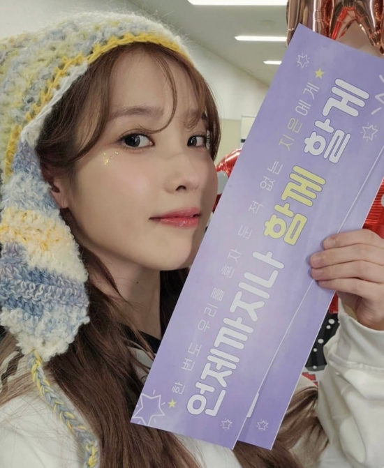 Singer IU showed off a warm friendship by certifying a hat she received as a gift from LE SSERAFIM's member Sakura.