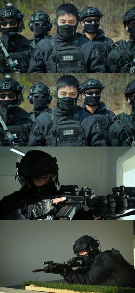 In this video, V is showing himself in combat shooting training in an urban area. In particular, V attracts attention by showing dashing posture and strong eye-contact while dressed with a 'military police' patch. Also, V is skillfully handling a firearm and strikes a target every time, which is impressing.