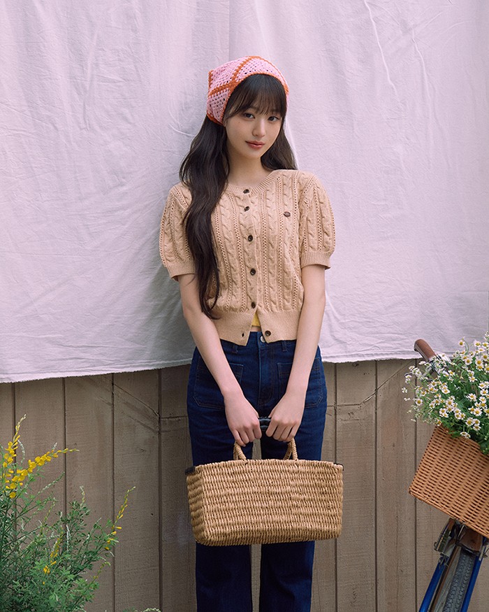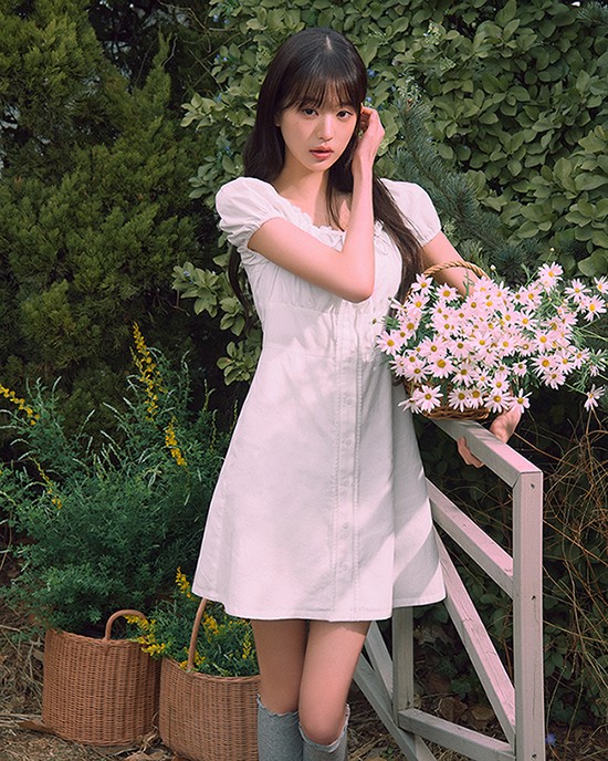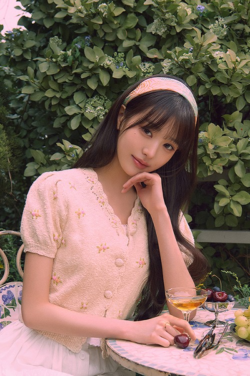 In addition, Jang Won-young created the newly released dog graphic T-shirt in a witty way with an illustration of a dog wearing sunglasses. Offering a variety of knitwear that are easy to wear even in the middle of summer, including a cable short-sleeve cardigan with voluminous sleeves that adds a romantic mood, and a short-sleeve cardigan with a girlish look with flower embroidery and lace details, she also presents dresses and blouses with lovely styles made of light materials and details such as shirring, lace, and ribbons.