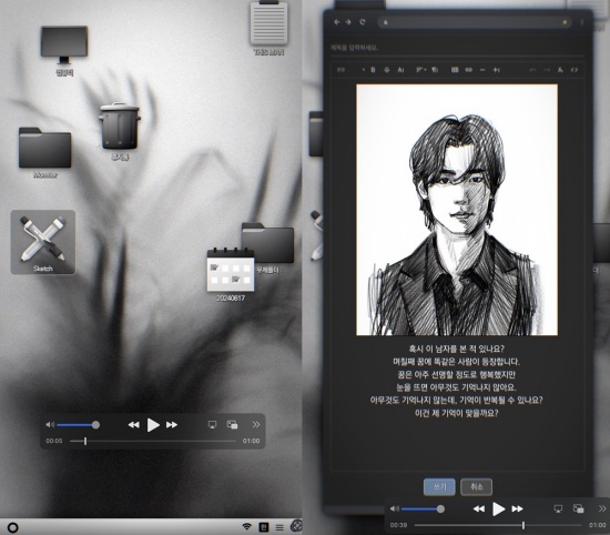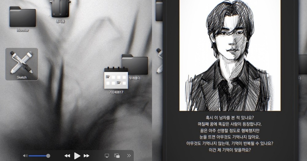 The video shows the process of drawing a montage of a man in a first-person perspective. The man's face in the painting is subtly different from the left to the right, stimulating curiosity.