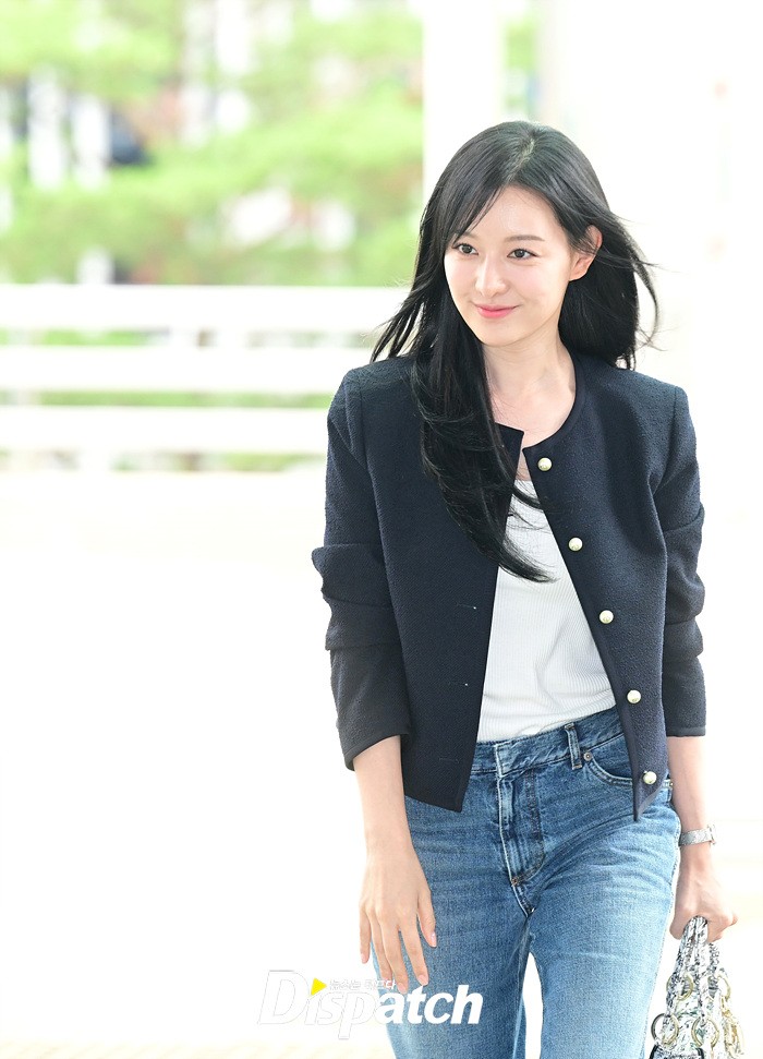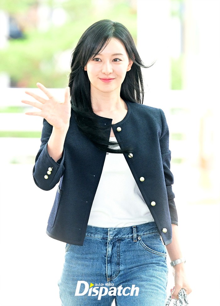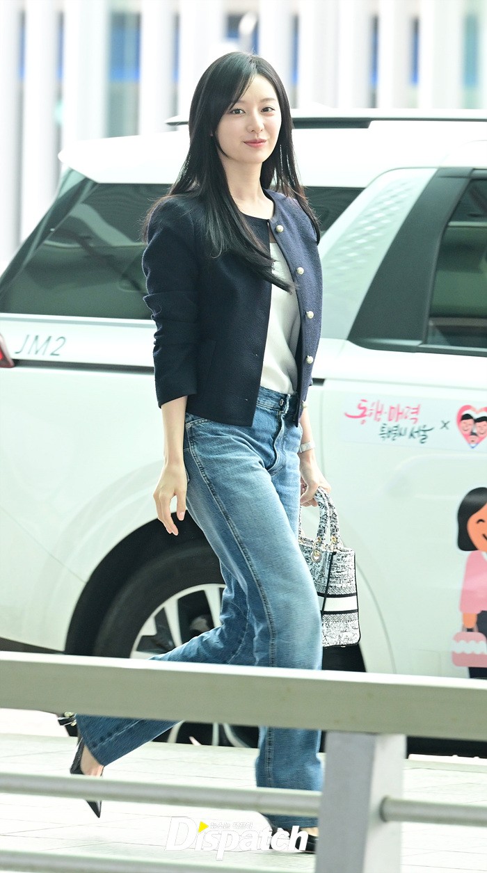 Kim Ji-won showcased a chic airport fashion with a black jacket and denim jeans. Her lovely smile and pure visuals also stood out.