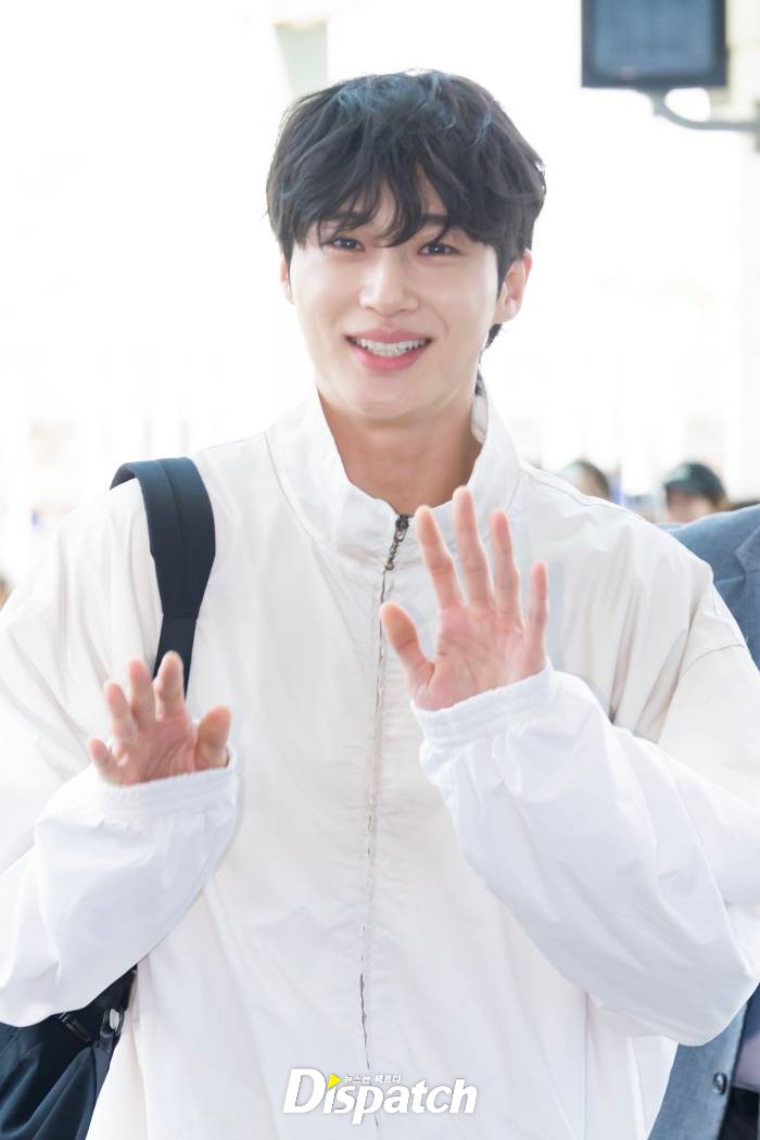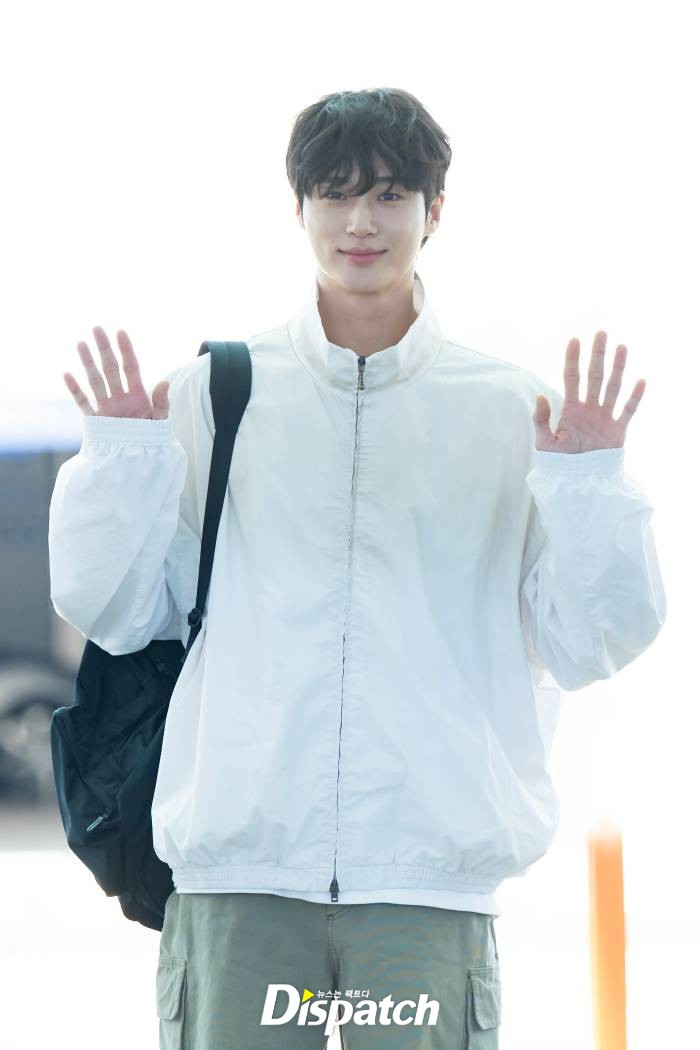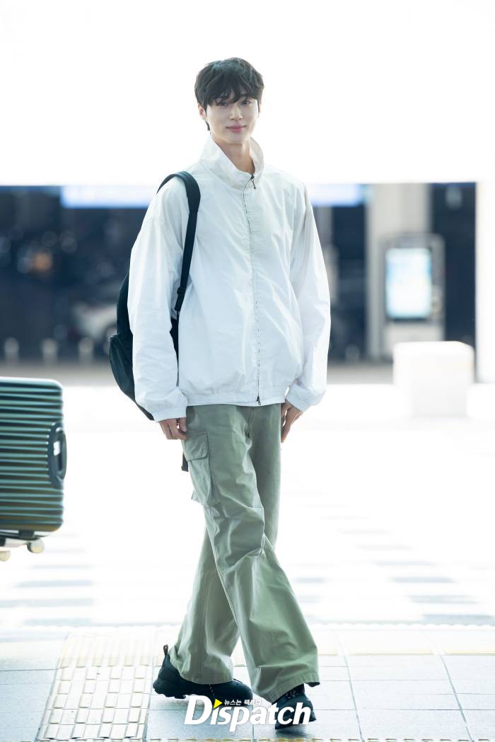 Byun Woo-seok styled himself in a zip-up jumper and cargo pants, and he gave a sweet greeting to the fans who came to see him off.