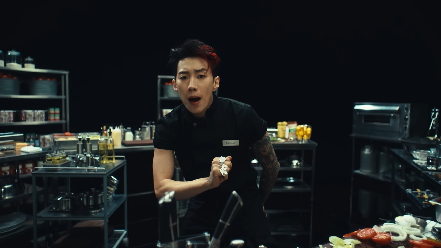 In the music video, Jay Park played the role of a hamburger chef. He metaphorically expressed the process of cooking 'nasty' situations in a dark kitchen.