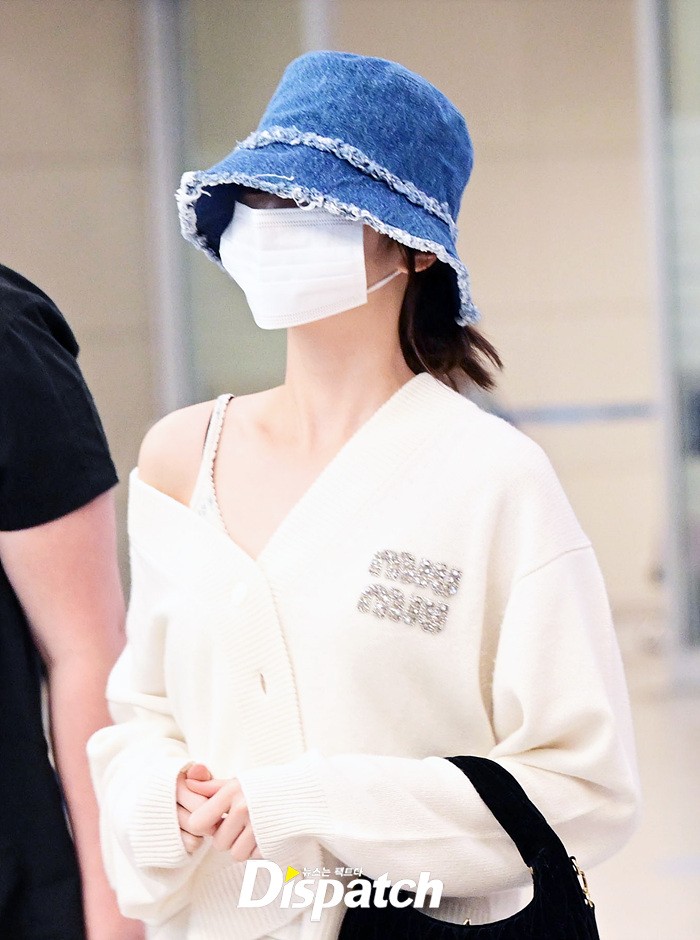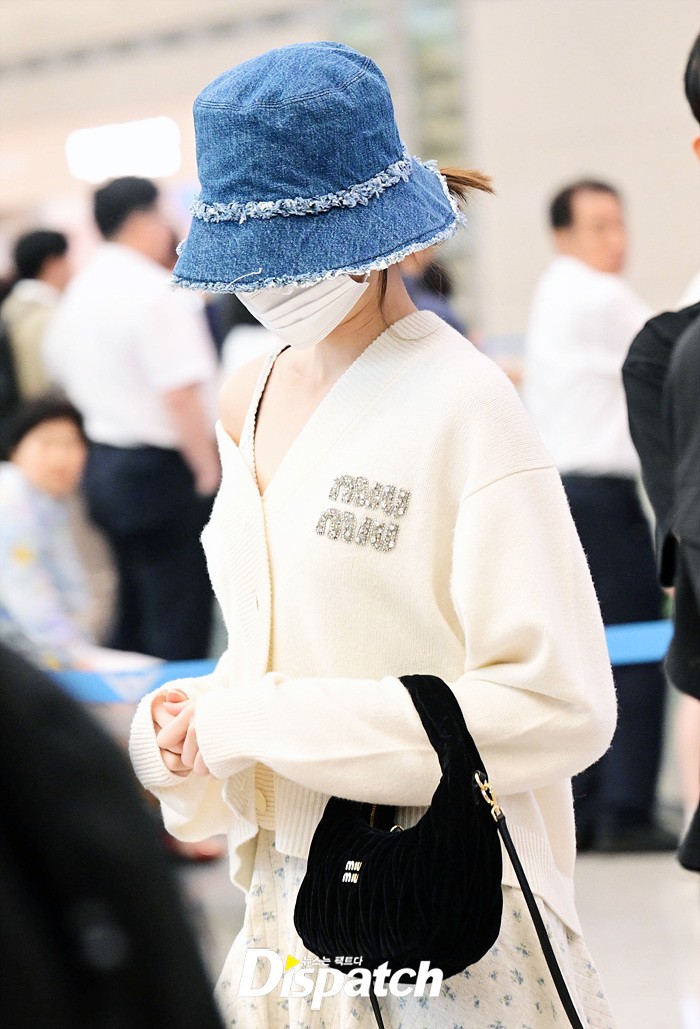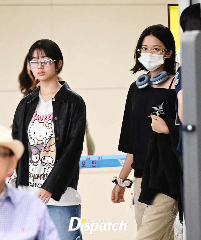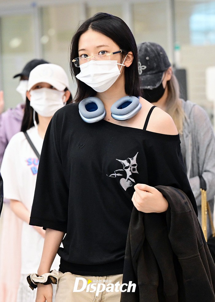 Ahn Yujin also caught attention with her fresh visuals despite wearing a mask. Her stylish airport fashion, featuring a black one-shoulder T-shirt, glasses, and headphones, also stood out.