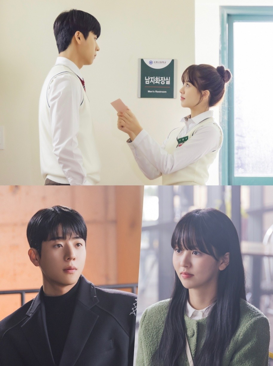 The still cuts contain a timeline from the age of 19, when first love began, to the age of 29. First, Lee Hong-joo and Kang Hoo-young's first meeting in front of the school gate. Hongju put her Hoo-young's arm around her shoulder and smiled naturally. On the other hand, Hoo-young had a shocked expression.
