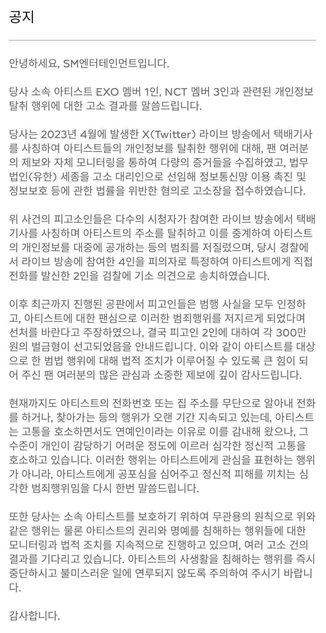 On the 10th, SM Entertainment reported the results of a complaint regarding the theft of personal information related to EXO and NCT on the reporting site 'Gwangya 119'.