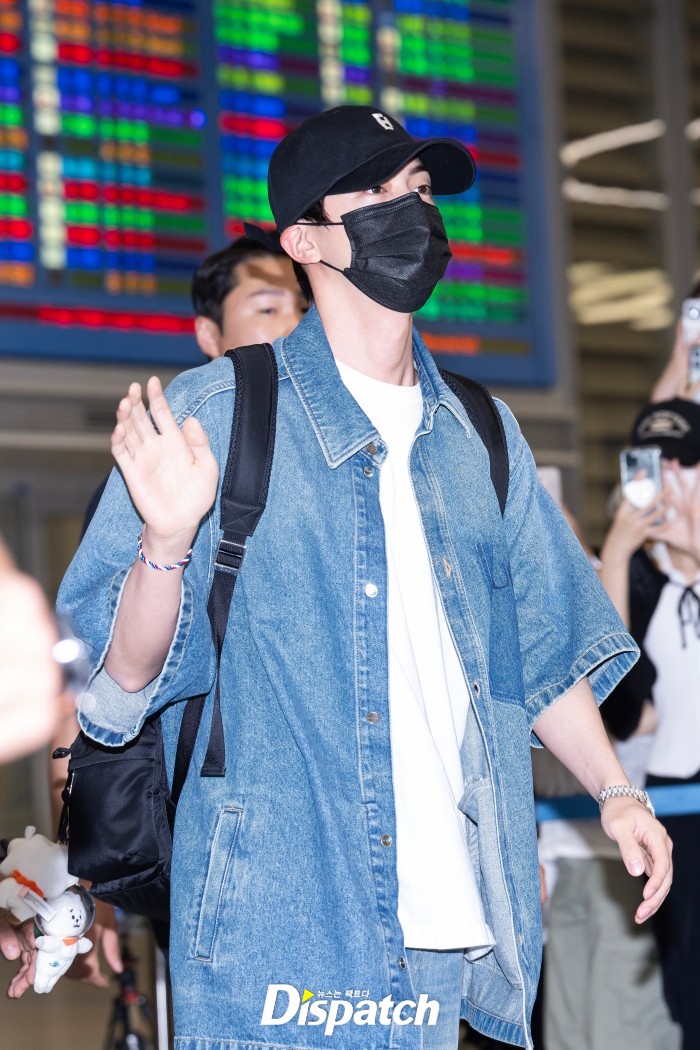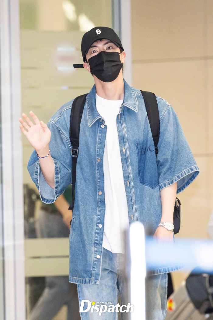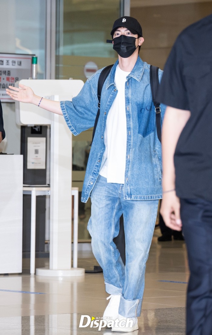Jin looked stylish in a denim shirt and pants, highlighting his handsome visuals. He waved to the fans who came to greet him, offering a warm fan service.