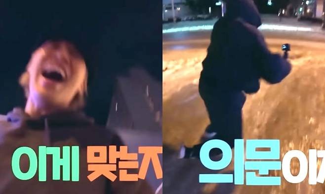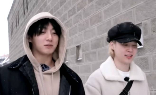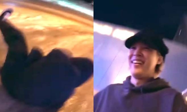 In the video, Jimin and Jungkook visit the US, Jeju Island, and Sapporo, Japan, and there is a scene where Jungkook slips on an icy road while running. Jungkook gets up right after falling, and Jimin, who was watching, vividly captures the scene on camera while laughing out loud. Around them, a road is frozen so hard that it looks difficult to walk.
